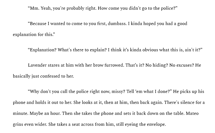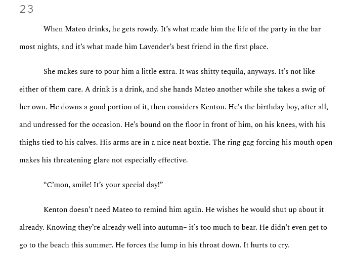 This arc follows Lavender over the course of Kenton's captivity with Mateo.  She decides to run away from the shattered ruins of her life to join her friend, a human trafficker and serial killer, as he relentlessly abuses a boy she could've known.